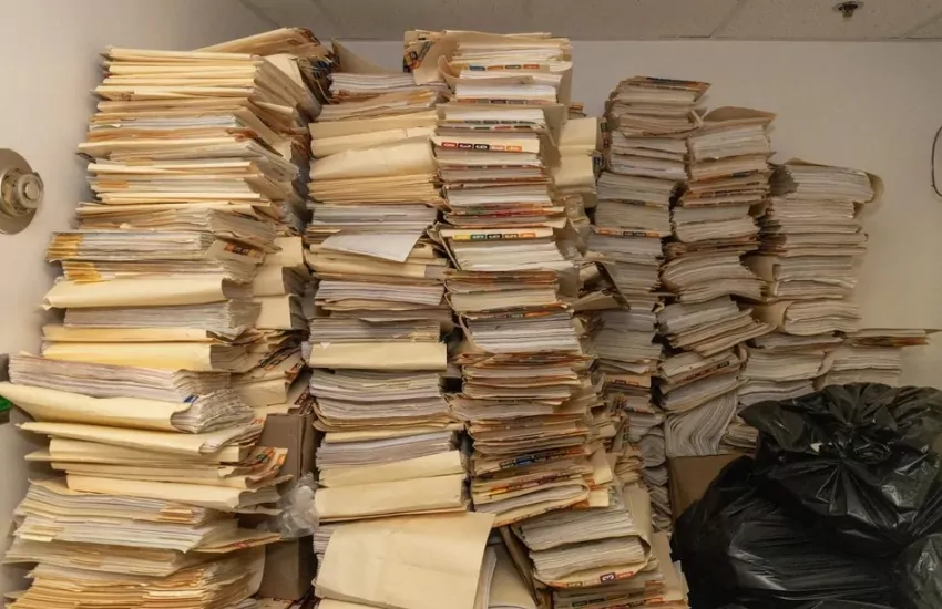 Deep in a crumbling building, there is a room filled with folders.