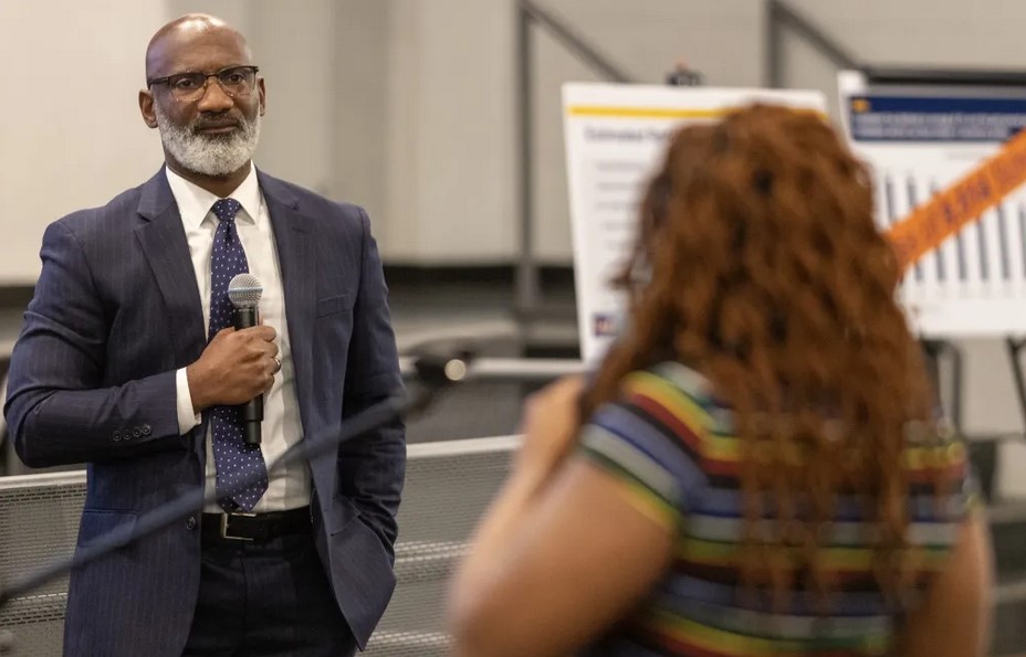 Superintendent of Jackson Public Schools Errick Greene speaks about school closures during a JPS community meeting at Forest Hill High School in Jackson, Miss., Monday, October 9, 2023. JPS announced its plan to close or consolidate 16 schools. Credit: Eric J. Shelton/Mississippi Today