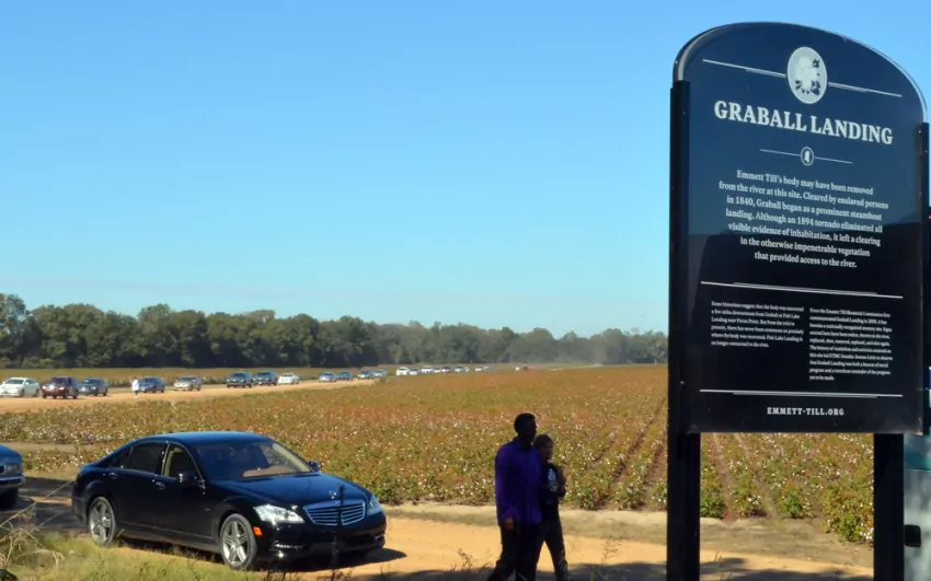 In the photo, a caravan of vehicles arrives at Graball Landing for a program celebrating a new sign near the site where the body of Emmett Till may have been pulled from the Tallahatchie River in 1955.