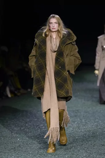Models wore double-breasted coats buttoned all the way up to the neck, as if bracing against the inclement British weather. Some donned mannish, oversized coats in military greens and browns paired with matching wide-leg trousers, while others covered up with an elegant silk scarf wrapped around the head.