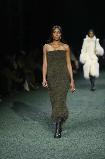 Supermodel Naomi Campbell, sashaying in a shimmering bronze strapless column gown, rounded out the show.
