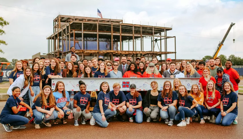 Northwest Mississippi Community College President, Dr. Michael J. Heindl (center) poses with Northwest Fine Arts students in front of the construction site of the college’s new Performing Arts Center during a Topping Out ceremony held on Friday, Oct. 15. A separate ceremony took place on Thursday, Oct. 14, for members of Northwest’s Board of Trustees. The new facility, located on the college’s main campus in Senatobia, will hold classroom space, multiple band and music practice halls, an art gallery, recording/audio studio, and a 1,200-seat performing arts auditorium that will host a variety of acts. The building is on track to be completed in the fall of 2022.