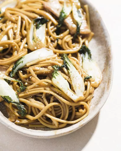To the now-empty skillet, add the bok choy; cook, stirring often, until the leaves are wilted and the stems are translucent, about 2 minutes. Add the noodles and soy mixture. Cook, stirring often, until the noodles have absorbed most of the liquid, 3 to 4 minutes. Add the pork and any accumulated juices. Cook, tossing, until the noodles are dry, 1 to 2 minutes. Off heat, taste and season with white pepper.
