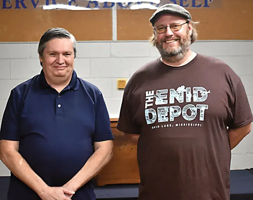 Brent Tippitt, right, owner and executive chef of The Enid Depot, was the guest speaker of the Charleston Rotary Club on Wednesday, Oct. 15. Tippitt shared his future growth plans for the restaurant and the recent success of adding the location to the National Register of Historic Places. Pictured with Tippitt is Rotary President Ray Clolinger.