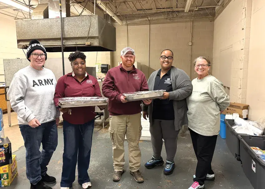 Providing cooked meals to warming shelters and distributing food to those in need in their communities were two of several ways that personnel with the Mississippi State University Extension Service responded during and after the Jan. 23-27 extreme winter weather event. Pictured above, helping to manage one of those shelters in Grenada County were Gigi Scallion, left, and Lynn Bailey, right. In the middle, Mississippi State University Extension Grenada County agents Ontenncia Boclear, Michael Pruden and Monika Latham prepared some of those meals. (Courtesy photo/MSU Extension Service)