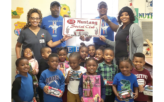 James Shoemaker and Henry Hampton, members of the 5.0 Mustang Social Club, are pictured delivering Christmas gifts from the club to students in two classrooms at West Tallahatchie Head Start Center in Glendora: classroom A, teachers Barbara Price and Pearlie Hodges with 20 children, and classroom D, Yolanda Pittman and Sharon Willis with 16 children.