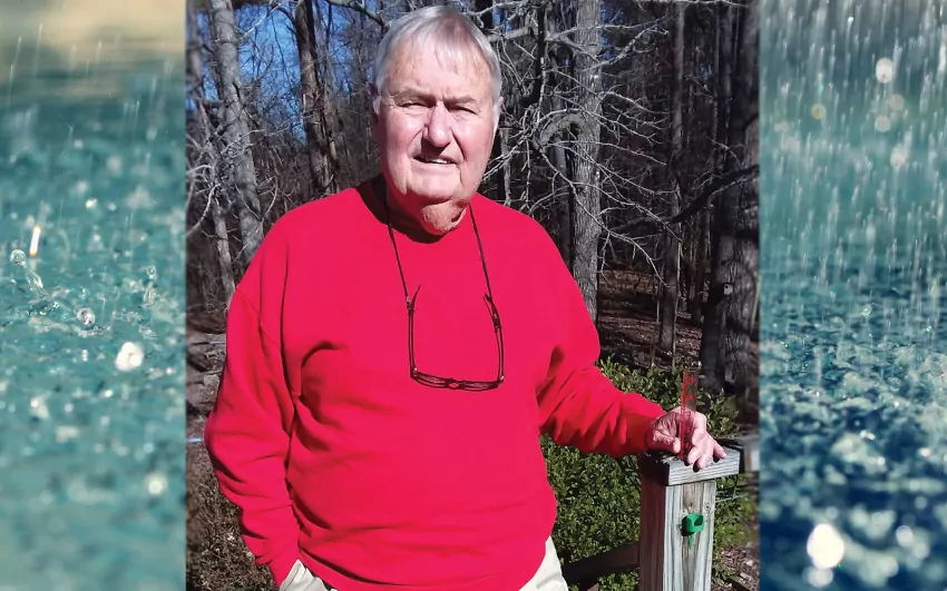 IN THE PHOTO: James L. Mitchell poses with the little rain gauge that he uses to record rainfall amounts at his Ascalmore Creek Road residence. (Photo by Faye Miller Mitchell)