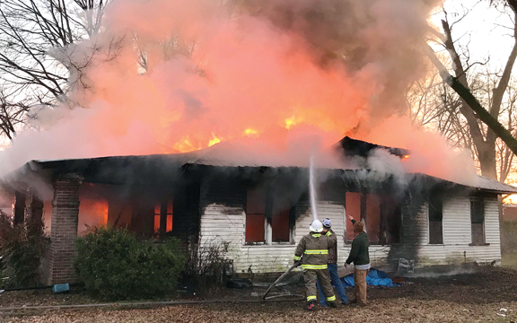 Firefighters train a hose on a house at 107 King Drive Thursday. (Photo by Clay McFerrin)