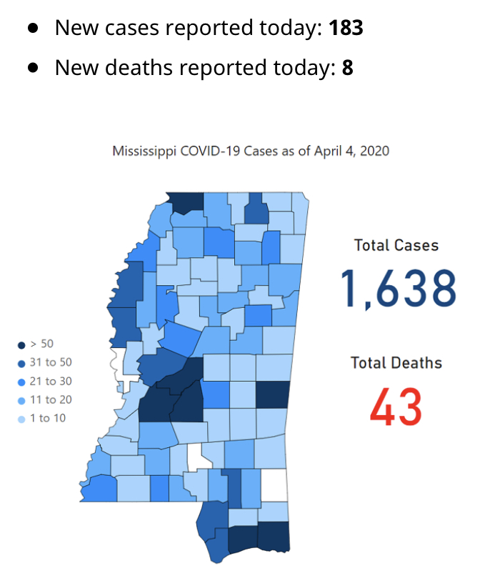 The new statistics push the total number of COVID-19 cases in the state since March 11 to 1,638 with 43 deaths. MSDH updates its map and statistics each morning with test results from the previous day.
