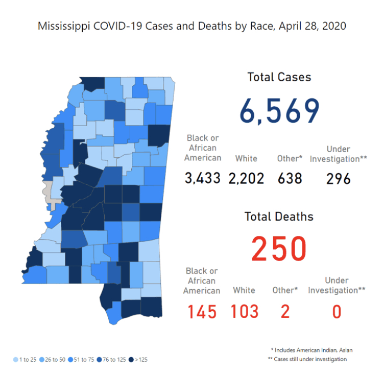 The new statistics bring the total number of COVID-19 cases in the state since March 11 to 6,569, with 250 deaths. MSDH updates its map and statistics each morning with test results from the previous day.