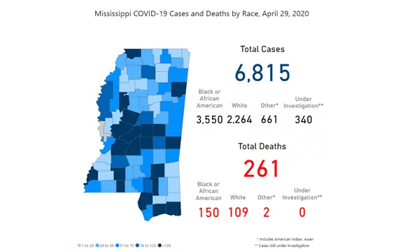 The new statistics bring the total number of COVID-19 cases in the state since March 11 to 6,815, with 261 deaths. MSDH updates its map and statistics each morning with test results from the previous day.