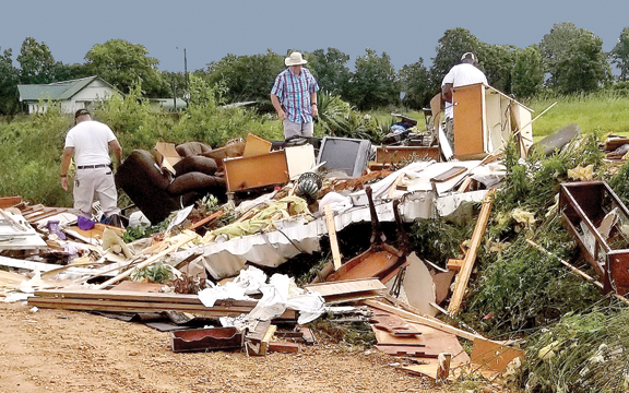 IN THE PHOTO: Monday morning, several men sift through the remains of Ruthie Ware's single-wide mobile home in the Paynes community. A windstorm destroyed the home and threw the elderly Ware into a ditch. (Photo by Thad Roberts)