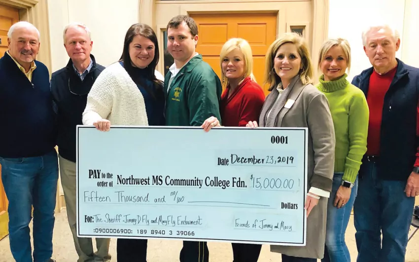 Representatives from Northwest Mississippi Community College are pictured in Charleston Dec. 23 to accept funds from donors wishing to establish a Foundation scholarship endowment in honor of Tallahatchie County Sheriff Jimmy Fly (fourth from left) and his wife Mary (third from left).