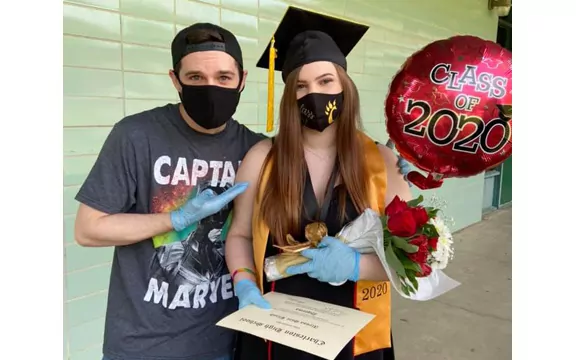 Proudly clutching some of the traditional trappings of a successful commencement ceremony — the requisite diploma and congratulatory roses and balloon — Charleston High School Class of 2020 graduate Alyssa Bland of Enid (right) also sports a couple of this year's must-have senior accessories.