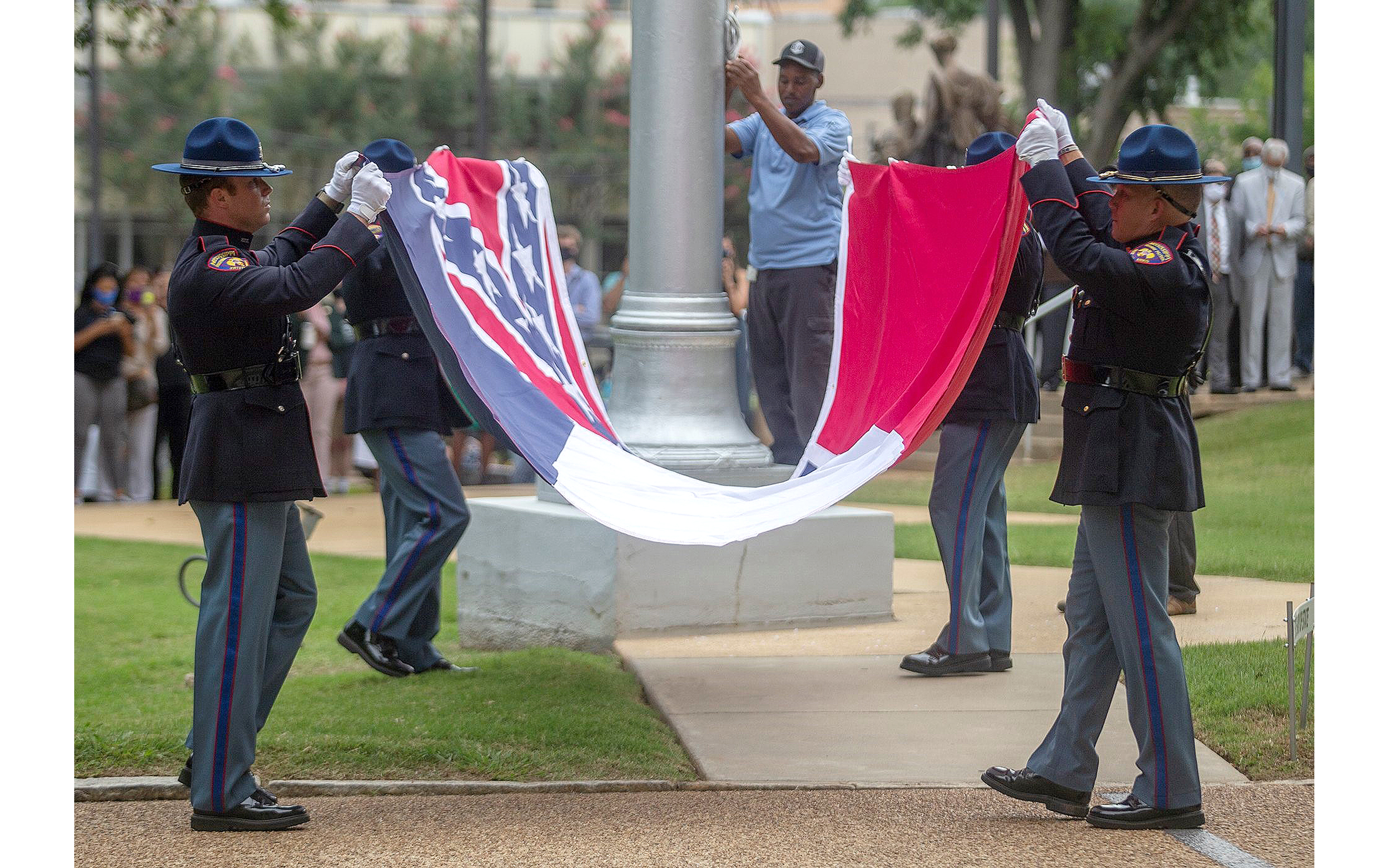 IN THE PHOTO: Mississippi Highway Patrol officers furl the state flag outside of the Capitol in Jackson on Wednesday, July 1, 2020. (Photo by Eric J. Shelton/Mississippi Today)