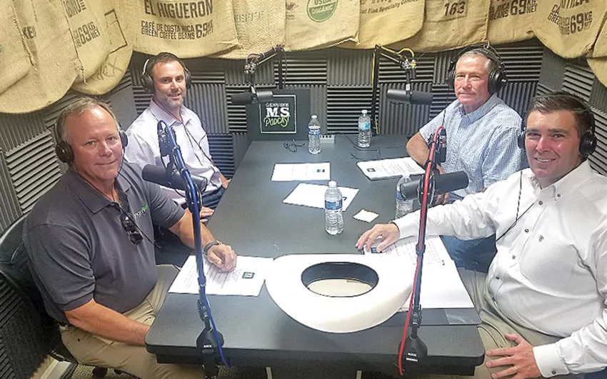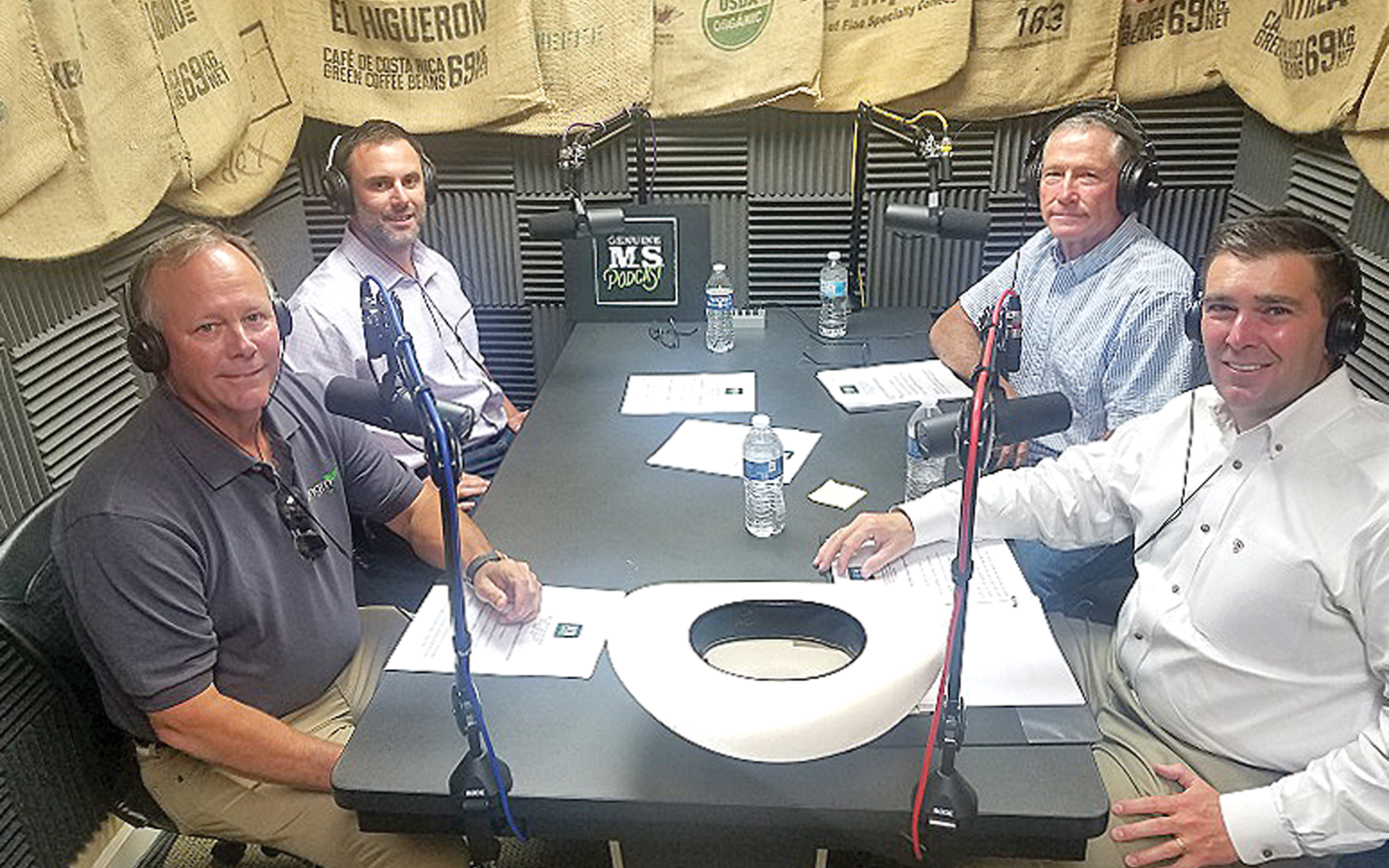 IN THE PHOTO: Mississippi Commissioner of Agriculture and Commerce Andy Gipson (right) prepares to record the eighth episode of the “Genuine MS Podcast,” Leaders in the Field, featuring Genuine MS Made members (clockwise, from left) Brent Brasher of Kengro Corporation near Charleston, Matthew Summers of Speedbox in Ridgeland, and Dennis Short of Shortline Manufacturing in Shaw. (Photo special to The Sun-Sentinel)