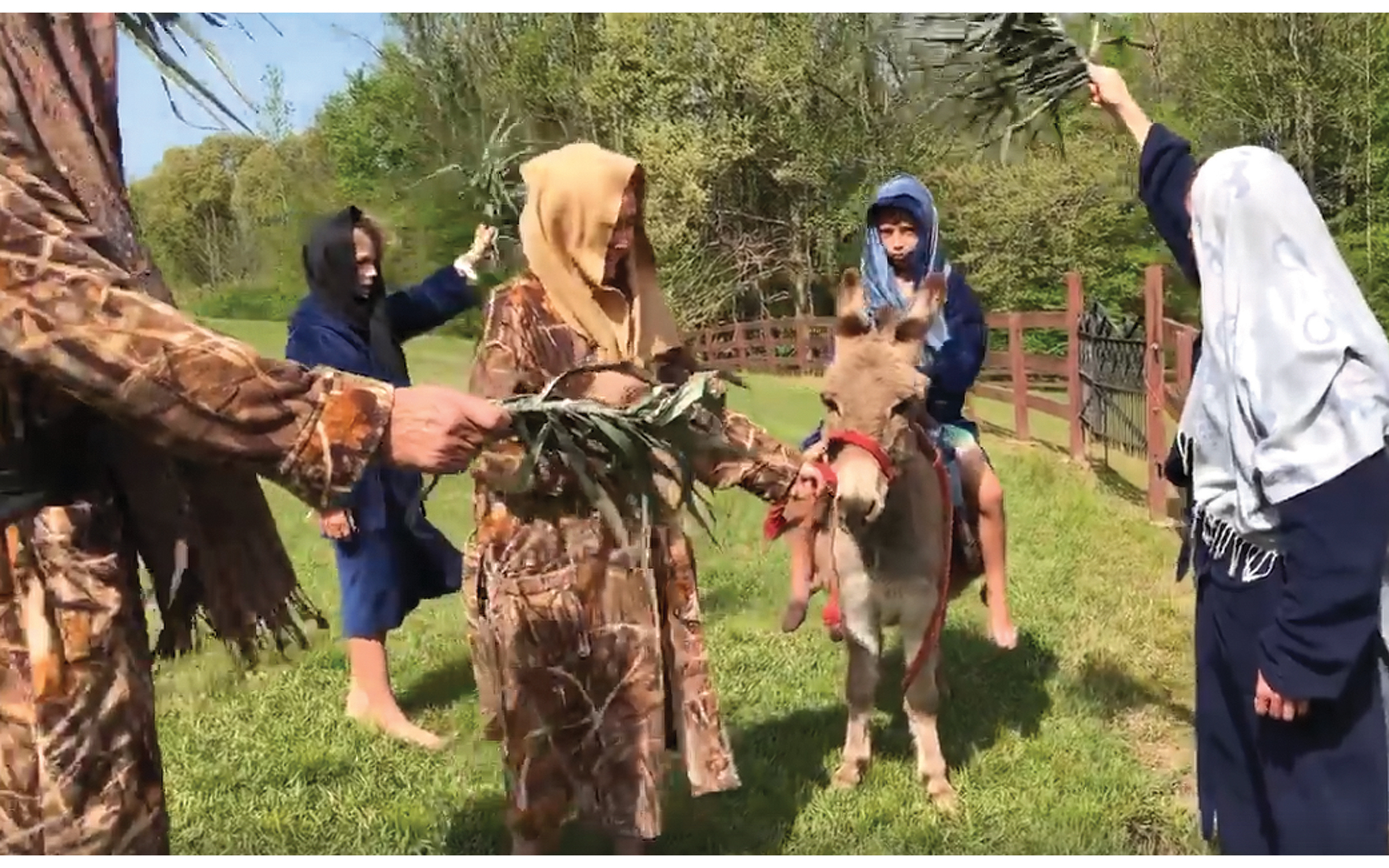 In the screenshot above, family members reenact Jesus’ triumphal entry into Jerusalem on the back of a donkey. According to the biblical story, many in the procession bore palm branches and shouted “Hosanna!” in praise of the man who proclaimed he was the Son of God.