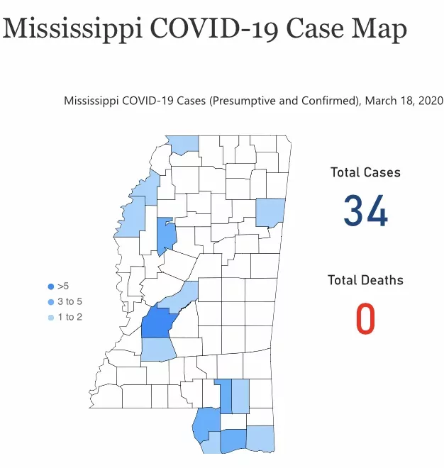 The 34 Mississippi coronavirus cases are distributed as follows: