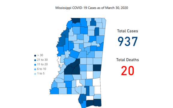 The new statistics push the total number of COVID-19 cases in the state to 937, with 20 deaths. MSDH updates its map and statistics each morning with test results from the previous day.
