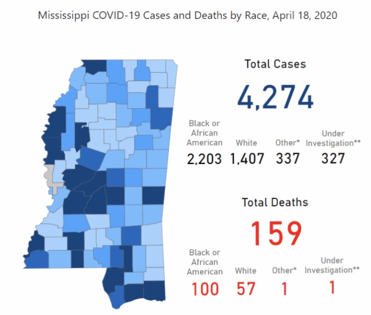 The new statistics bring the total number of COVID-19 cases in the state since March 11 to 4,274 with 159 deaths. MSDH updates its map and statistics each morning with test results from the previous day.