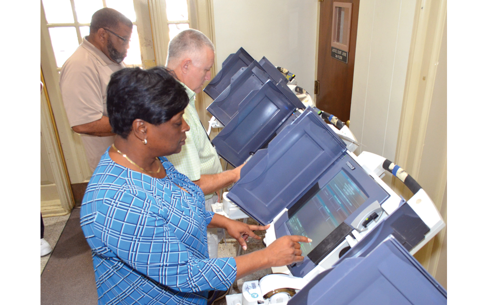 IN THE PHOTO: Clockwise from top left, Tallahatchie County Democratic Executive Committee member Richard Gipson, District 1 Election Commissioner Kelly Standard and Circuit Clerk Daphane Neal Tuesday perform logic and accuracy testing on Diebold TSx touch-screen voting machines that will be used in the Aug. 6 primaries. (Photo by Clay McFerrin)