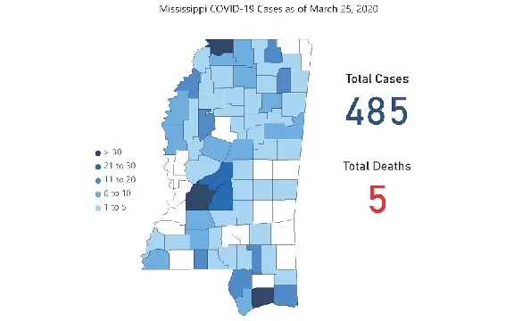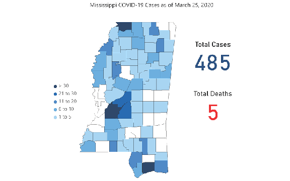 The state total now stands at 485, with five deaths, four of which were recorded yesterday. The number of cases is based on information reported by 6 p.m. Wednesday, March 25. MSDH does not disclose gender, age or other information about persons testing positive.