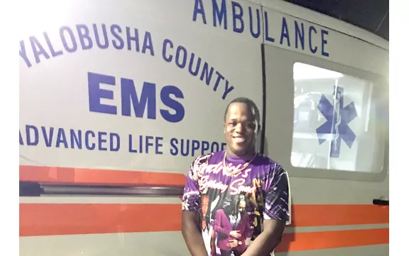 IN THE PHOTO: Acquedius Smith pauses for a photo in front of an ambulance after helping to save the life of a 64-year-old Charleston man who had suffered a medical emergency at his Holly Street home. (Photo special to The Sun-Sentinel)