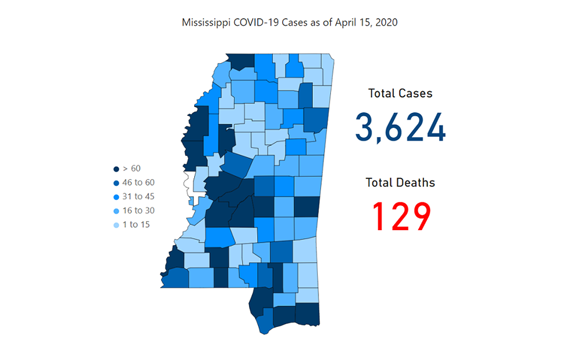 The new statistics bring the total number of COVID-19 cases in the state since March 11 to 3,624 with 129 deaths. MSDH updates its map and statistics each morning with test results from the previous day.