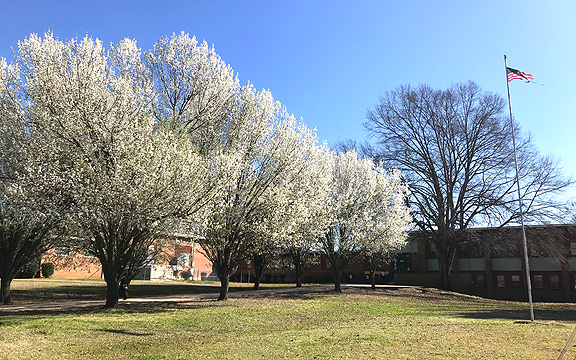 Pictured above, Bradford pear trees virtually glow in the morning sun on the west side of the Charleston High School campus on Friday, March 6, 2020.