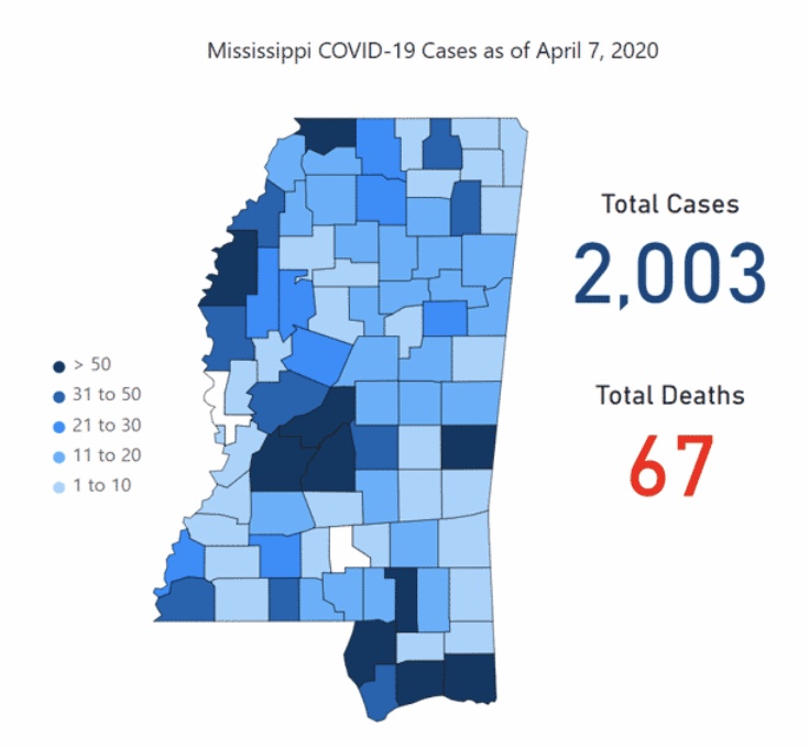 The new statistics push the total number of COVID-19 cases in the state since March 11 to 2,003, with 67 deaths. MSDH updates its map and statistics each morning with test results from the previous day.