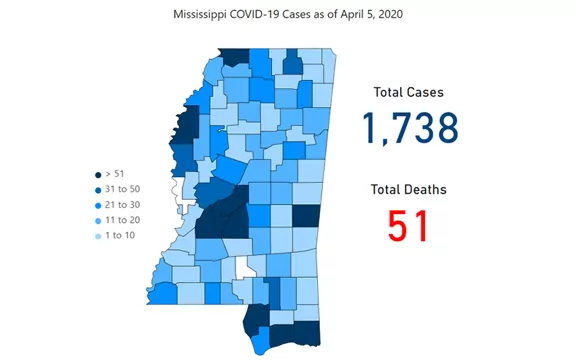The new statistics push the total number of COVID-19 cases in the state since March 11 to 1,738 with 51 deaths. MSDH updates its map and statistics each morning with test results from the previous day.