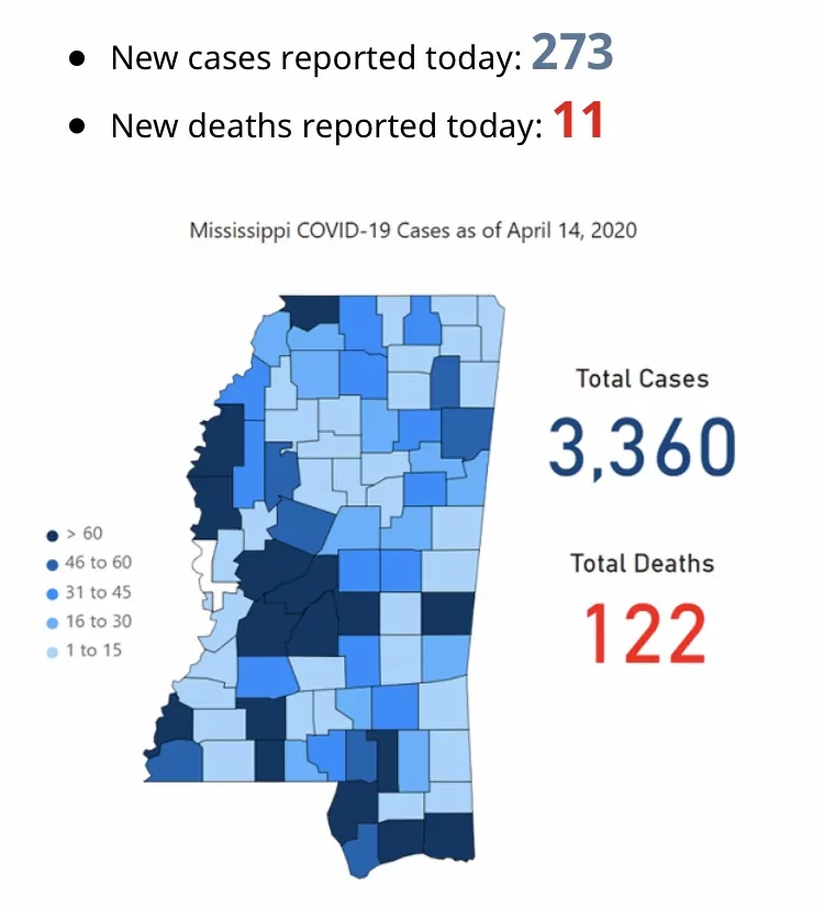 The new statistics, reflecting the largest single-day increase in the number of confirmed cases in Mississippi to date, push the total number of COVID-19 cases in the state since March 11 to 3,360 with 122 deaths. MSDH updates its map and statistics each morning with test results from the previous day.
