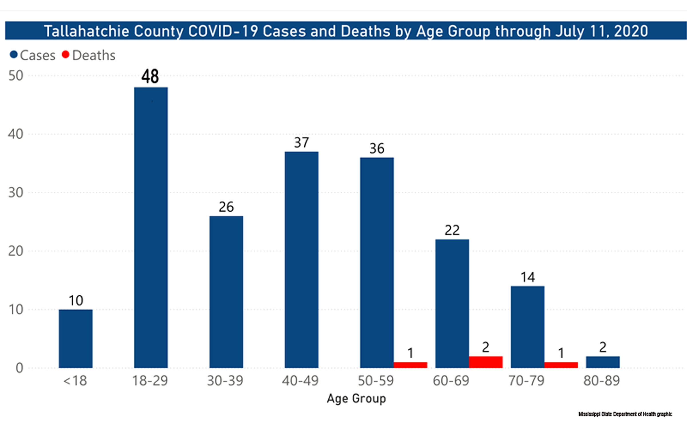 Tallahatchie County’s positive caseshave been reported to the public by MSDH on March 23 (1), March 24 (1), April 5 (1), April 13 (1), April 15 (2), April 16 (1), April 17 (1), April 22 (1), April 24 (2), May 2 (1), May 12 (1), May 13 (1), May 14 (1), May 15 (3), May 17 (1), May 18 (2), May 21 (2), May 24 (1), May 27 (1), May 28 (1), May 30 (1), June 2 (2), June 3 (1), June 5 (1), June 7 (1), June 8 (3), June 12 (two-day total of 4), June 13 (1), June 14 (2), June 15 (1), June 16 (2), June 17 (4), June 18-22 (15), June 23 (4), June 24 (4), June 25 (13), June 26 (3), June 27 (3), June 28 (2), June 30 (1), July 1 (10), July 2 (11), July 3 (7), July 4 (14), July 6 (1), July 7 (8), July 8 (11), July 9 (10), July 10 (12), July 11 (17), July 13 (2) and July 14 (9), July 15 (33), July 16 (8) and July 17 (13). The deaths were reported by MSDH on April 17, June 28, June 29 and July 3.