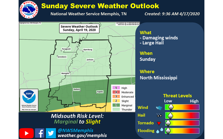 The National Weather Service in Memphis predicts a "marginal" risk of severe weather for North Mississippi, including Tallahatchie County, on Sunday, April 19.