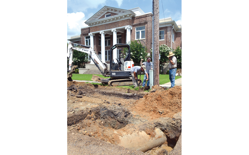 Against the backdrop of Sumner First Baptist Church, from left, Harrison Sandridge, Mark Guyer and Jason Sandridge, of boring subcontractor Grassland Inc. of Hernando, take a break July 17 from directional drilling for a 6-inch water line at the corner of Cassidy and Tate streets in Sumner.
