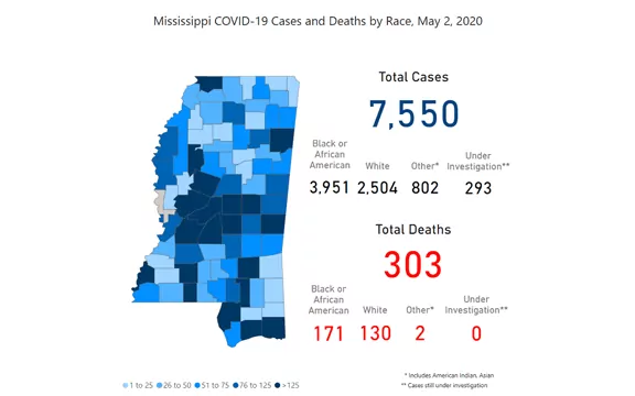 The new statistics bring the total number of COVID-19 cases in the state since March 11 to 7,550, with 303 deaths. MSDH updates its map and statistics each morning with test results from the previous day.