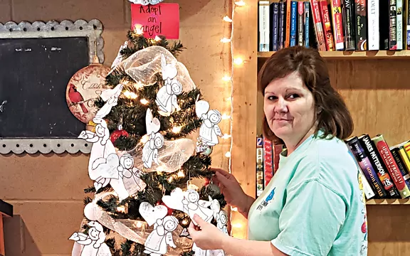 IN THE PHOTO: Jessica Strider stands alongside a Christmas tree at Strider Grocery that encourages area residents to adopt “angels.” (Photo special to The Sun-Sentinel)