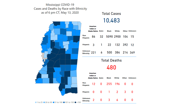 The new statistics bring the total number of COVID-19 cases in the state since March 11 to 10,483, with 480 deaths. MSDH updates statistics each morning with test results from the previous day.