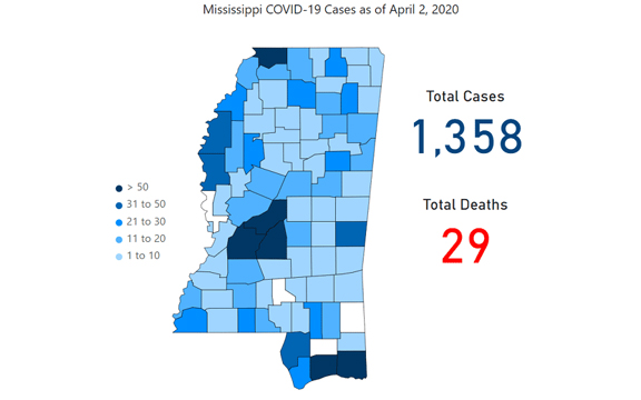 The new statistics push the total number of COVID-19 cases in the state to 1,358, with 29 deaths. MSDH updates its map and statistics each morning with test results from the previous day.