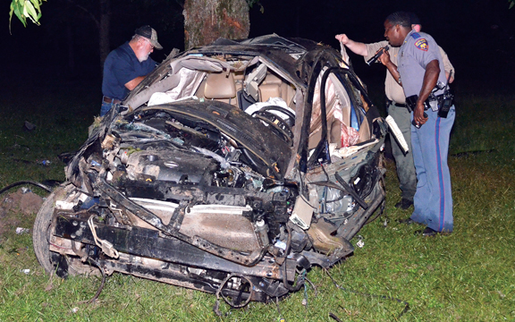In the photo, first responders peer into the mangled wreckage of a Nissan Maxima that was involved in a one-car accident just before 3 a.m. Wednesday, July 15.