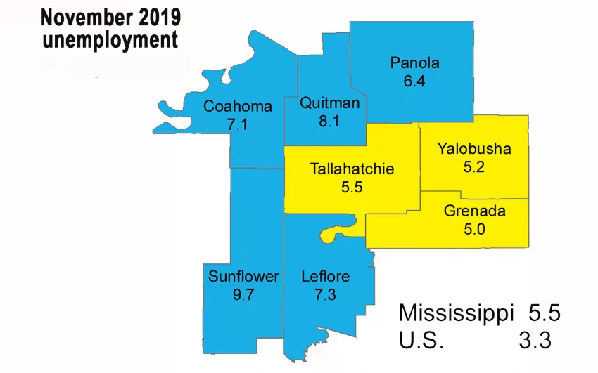Tallahatchie’s November unemployment rate is 1% higher than the 4.5% recorded in November 2018, when 240 of 5,310 labor force members were jobless.