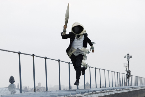 Is it from the “Phantom of the Opera” or “Assassin's Creed”? It's actually both and more. The mysterious torchbearer that appeared in a hooded, masked costume was inspired by a number of characters from French culture: Belphégor, the Iron Mask, the titular character from “Phantom of the Opera,” Fantomas, Ezio from “Assassin's Creed” and Arsène Lupin. The torchbearer ran atop the Musee d’Orsay, dashed past Pont Neuf, rode a boat with a kid holding the flame and later cartwheeled down a red runway.