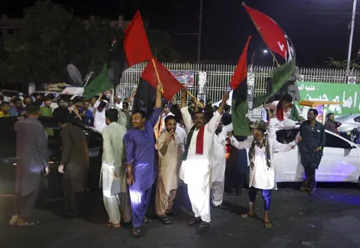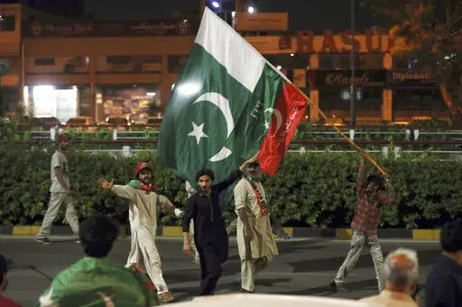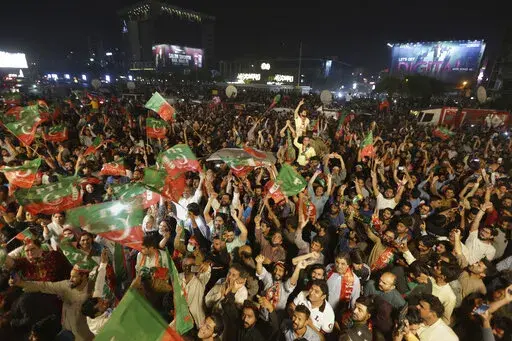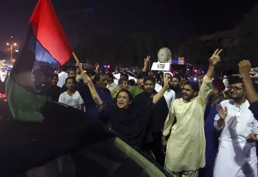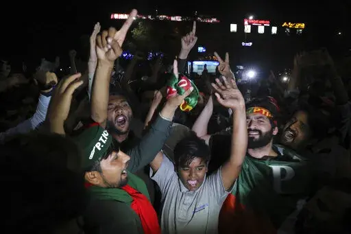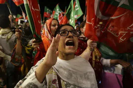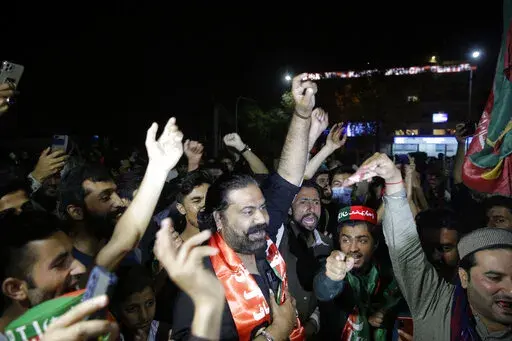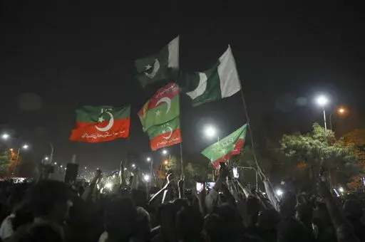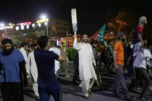 In the southern Arabian Sea port city of Karachi more than 20,000 shouted slogans promising Khan's return to power. In the capital of Islamabad, the lights from thousands of supporters lit up the night sky as Khan made his way through the crowd atop a brightly colored truck.
