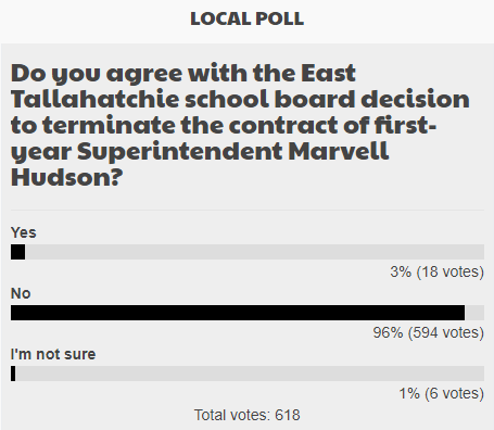 Ninety-six percent of respondents to a Sun-Sentinel poll that asked, “Do you agree with the East Tallahatchie school board decision to terminate the contract of first-year Superintendent Marvell Hudson?” said they did not.