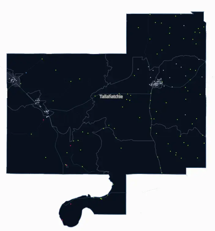 This cutout of the Broadband Equity, Access, and Deployment (BEAD) state access map features Tallahatchie County. The statewide view of the map shows all broadband serviceable locations within Mississippi colored by performance rank. (Screenshot from www.beam.ms.gov)