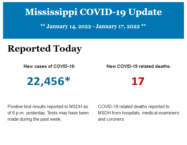 **New COVID-19 positive test results reported to MSDH for the four-day period (January 14 through January 17) as of 3 P.M. yesterday.