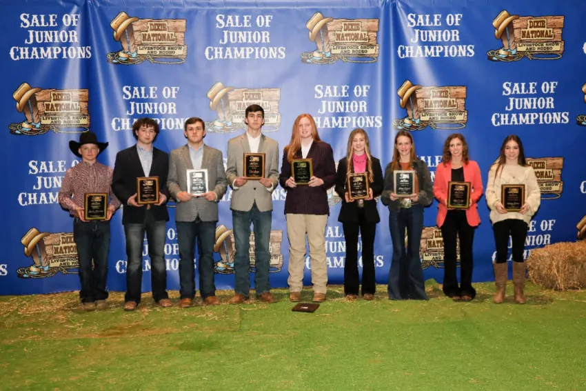 The final Sale of Champions featured 46 champion market animals, including 15 hogs, 12 goats, 10 lambs and nine steers. The preliminary total sale was $448,500, breaking the previous record by more than $40,000. The Sale of Champions Promotion Committee raised $61,500 in scholarships, including numerous $1,500 scholarships for high school senior exhibitors. This year, scholarships were awarded to 39 student participants of the Dixie National Junior Round-Up Livestock Shows.