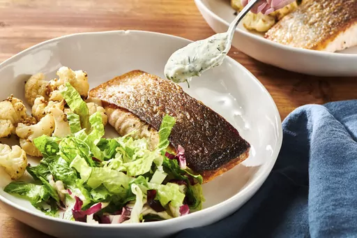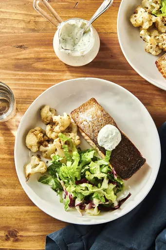 Pair your fish with a cool and creamy dill sauce and a couple of simple sides, and you have a restaurant-worthy meal in the comfort of home. Suggested sides include roasted cauliflower, a simple green lettuce salad, or roasted asparagus and a couscous salad.