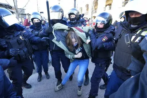 In St. Petersburg, where several hundred gathered in the city center, police in full riot gear were grabbing one protester after another and dragging some into police vans, even though the demonstration was peaceful. Footage from Moscow showed police throwing several female protesters on the ground before dragging them away.