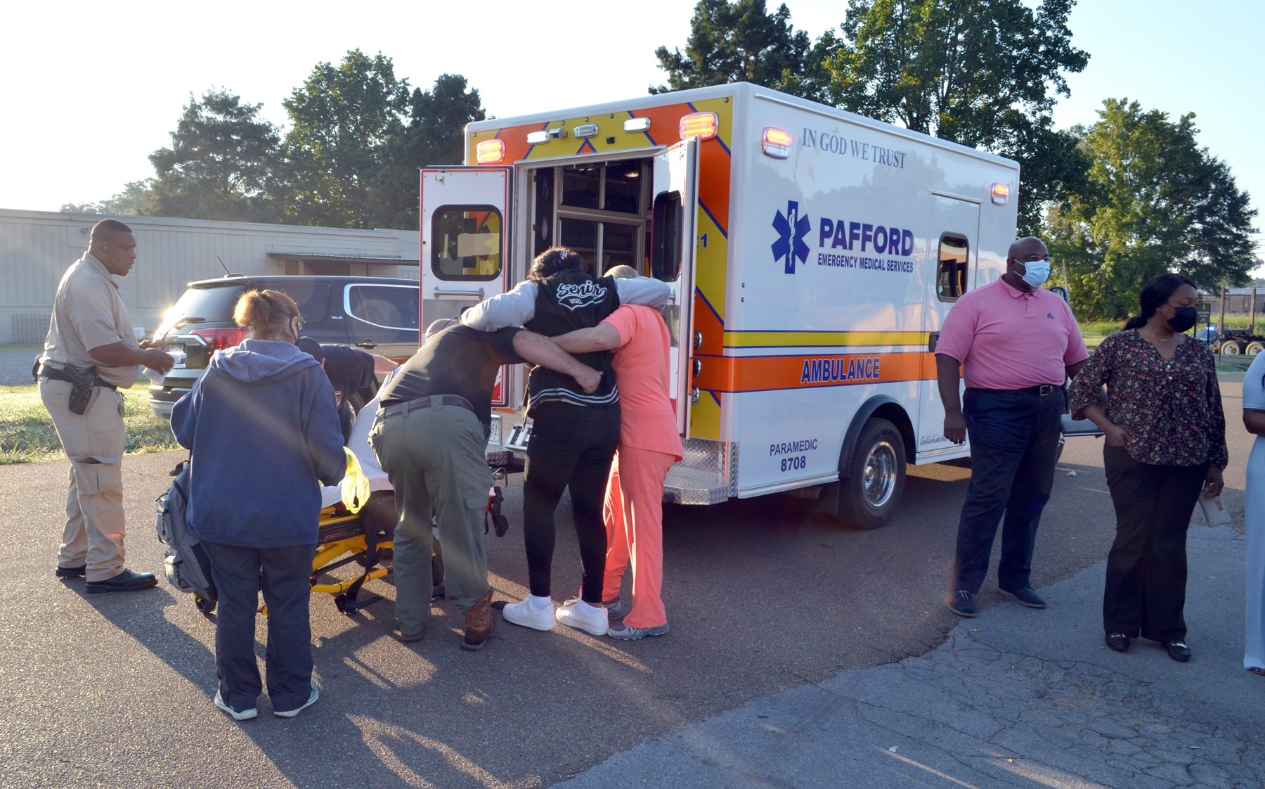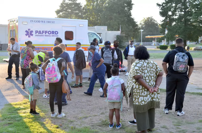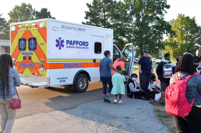 Students were evaluated by medical personnel at the scene, and at least one student was observed being assisted onto an ambulance gurney. The student was upright and walking.